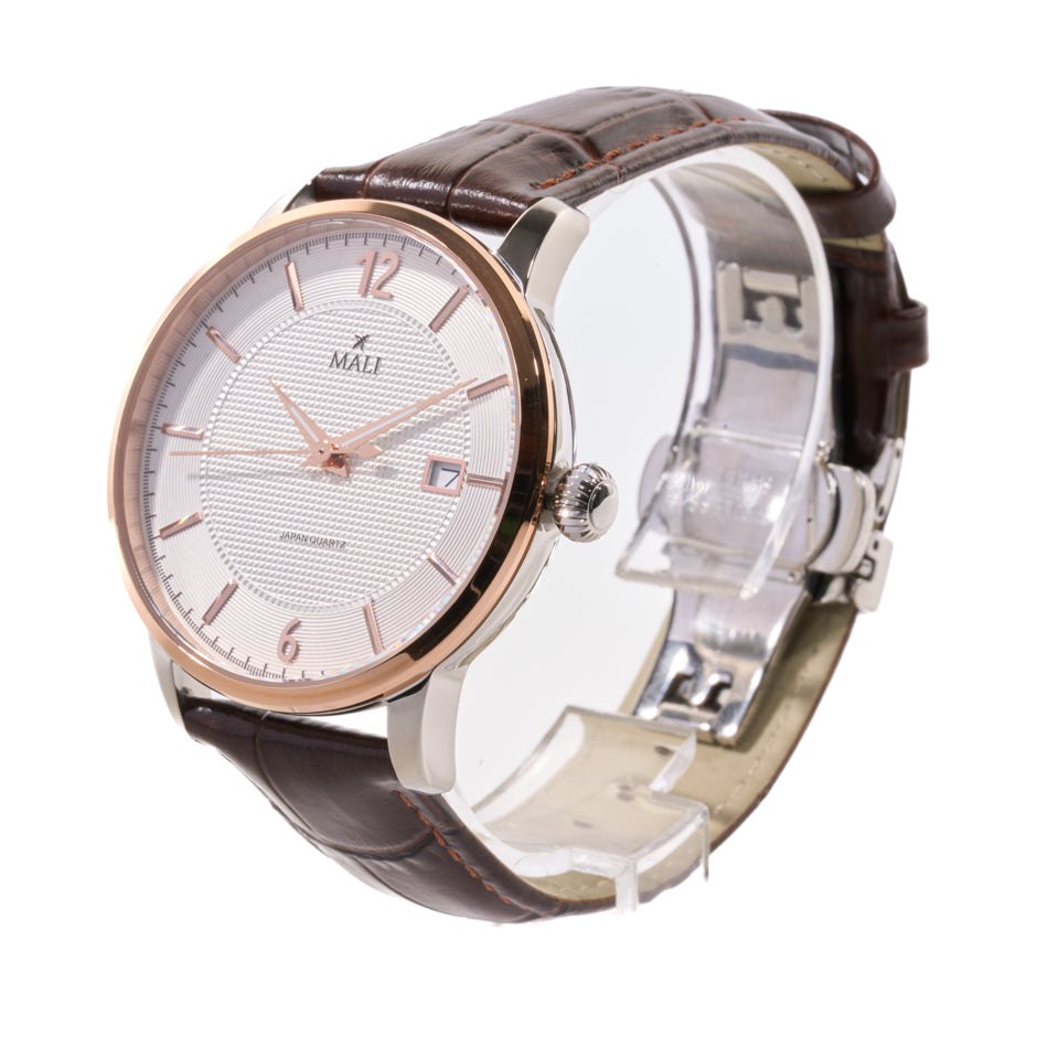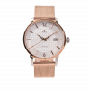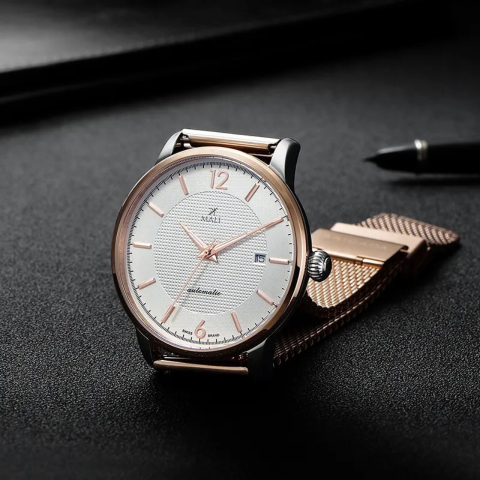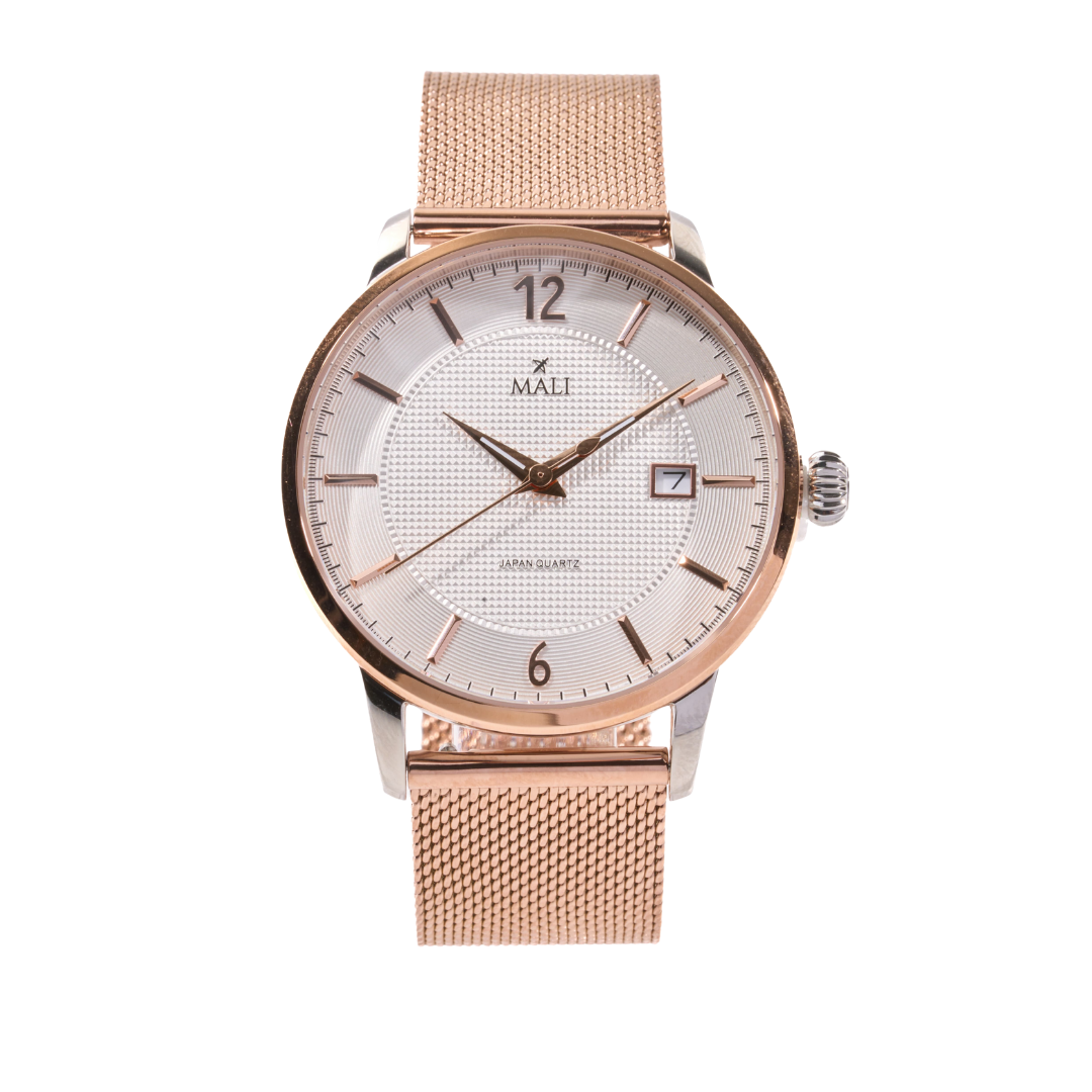 Limited Edition Luxury mechanical timepiece for men who want a timeless style.  Rose gold minimalist watch, with a white textured face and a round filleted crown.