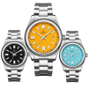 The Seafarer has an unprecedented water resistance up to 100 meters (10ATM) for a watch in it price and class range with a special lock in crown. The stylish world class automatic dive watch is available in vibrant yellow, black and blue faces with solid silver bracelet and folding clasp buckle which is the hallmark of modern luxury watches.