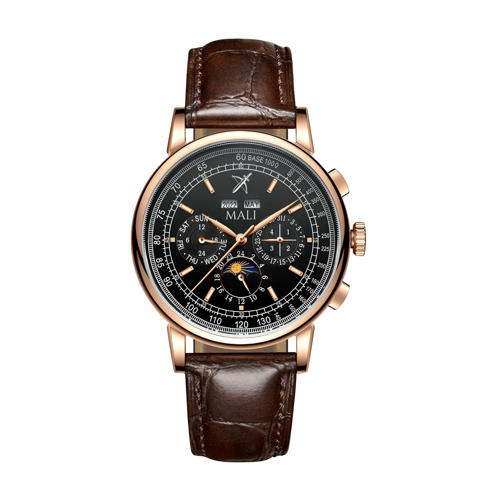 Premium Luxury Automatic Moon Phase mechanical watch with exquisite workmanship.An absolutely classic design. It uses our most sophisticated and complicated watch movement with day, month, year, week and moon phase functions. The complications can be seen from the glass back of the timepiece. The timepiece is waterproof up to 50m.