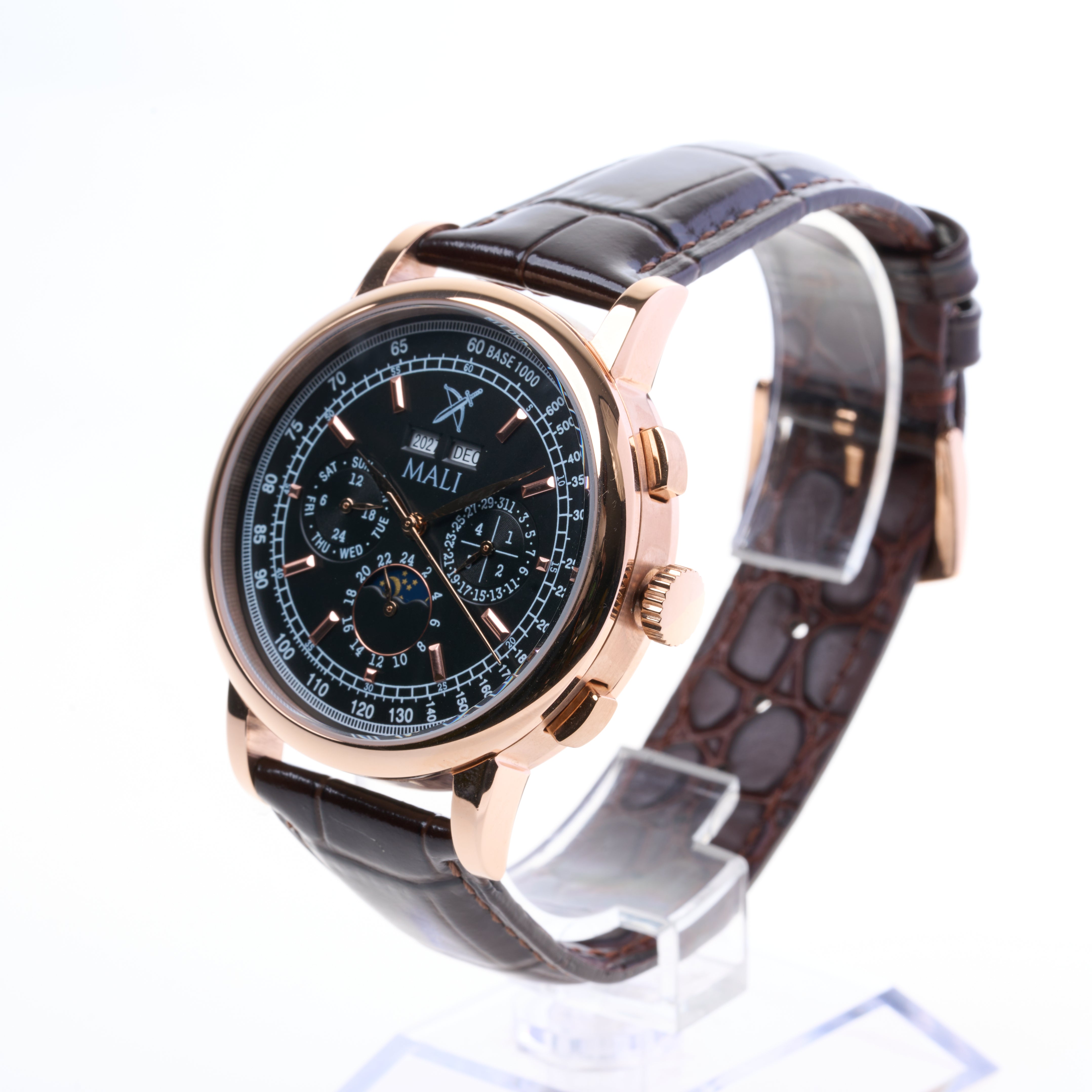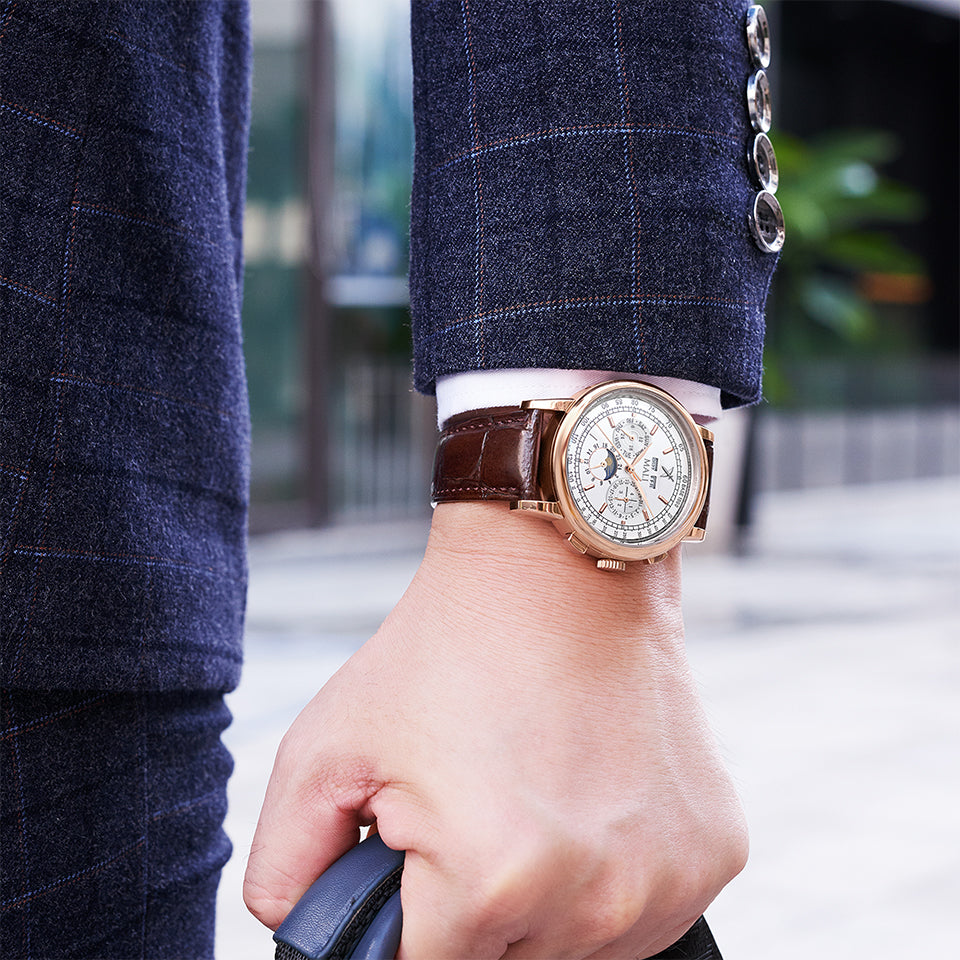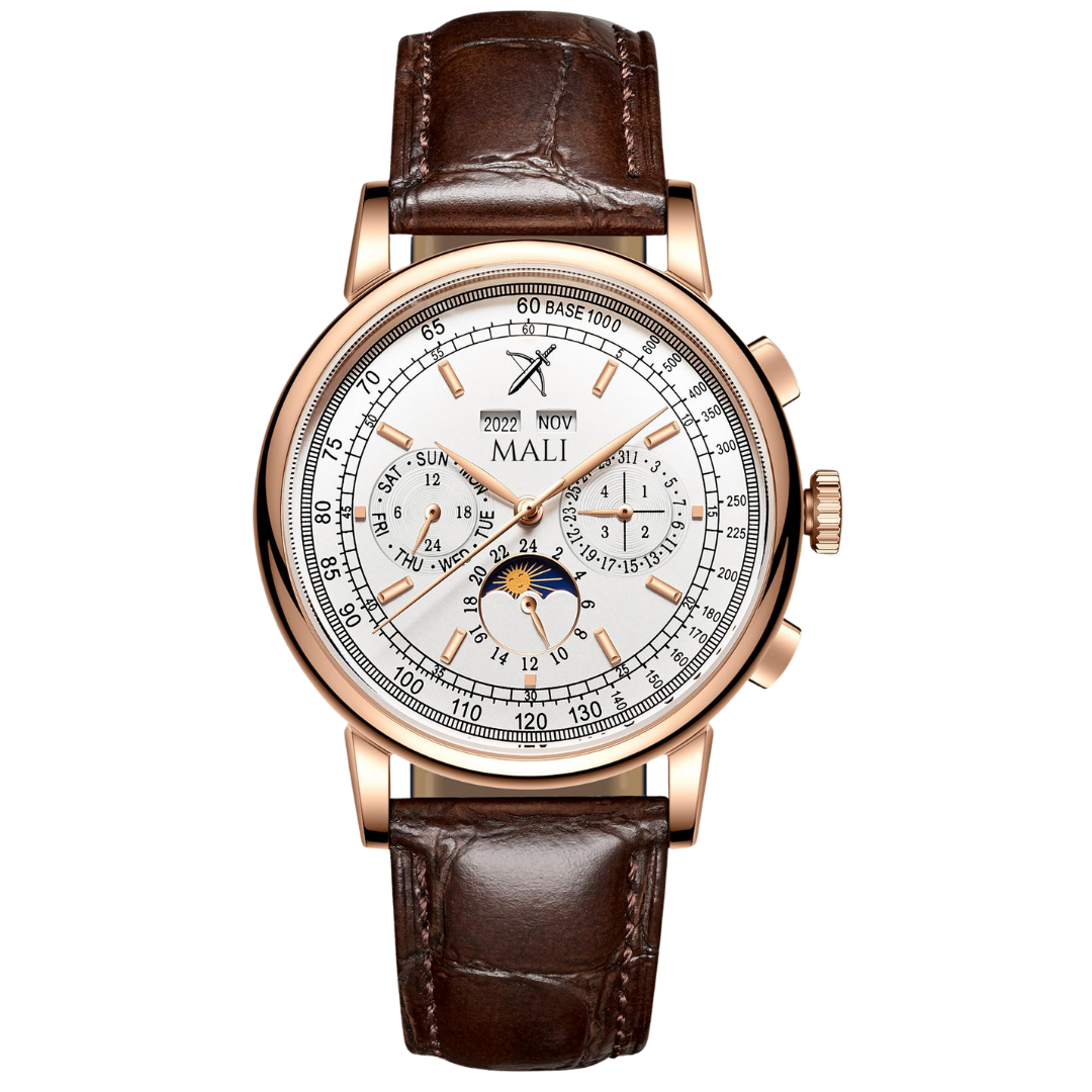 Premium Luxury Automatic Moon Phase mechanical watch with exquisite workmanship.An absolutely classic design.  It uses our most sophisticated and complicated watch movement with day, month, year, week and moon phase functions. The complications can be seen from the glass back of the timepiece. The timepiece is waterproof up to 50m.